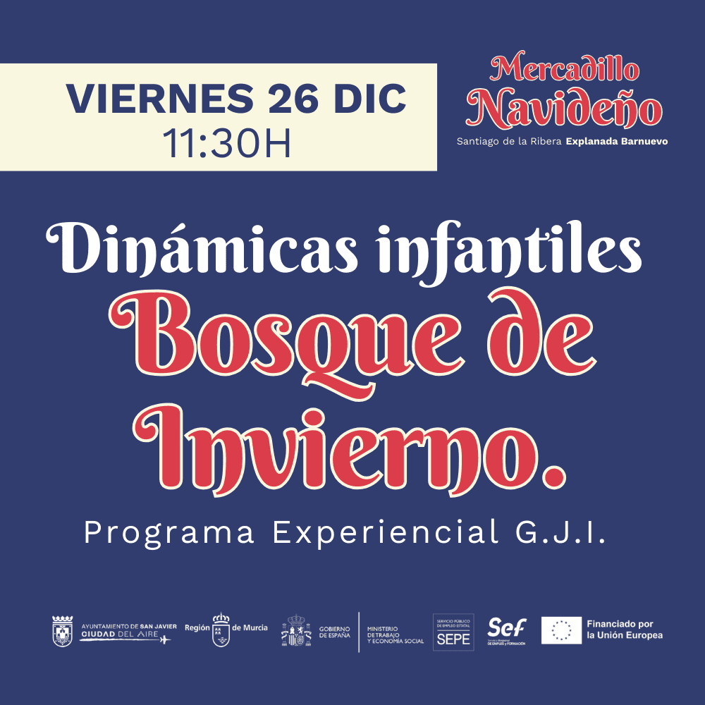 Inscripciones abiertas para Bosque de inviernoRealiza tu inscripción y los peques podrán adentrarse en un mundo mágico lleno de juegos, movimiento y sorpresas invernales en el Mercadillo Navideño de Santiago de la Ribera.